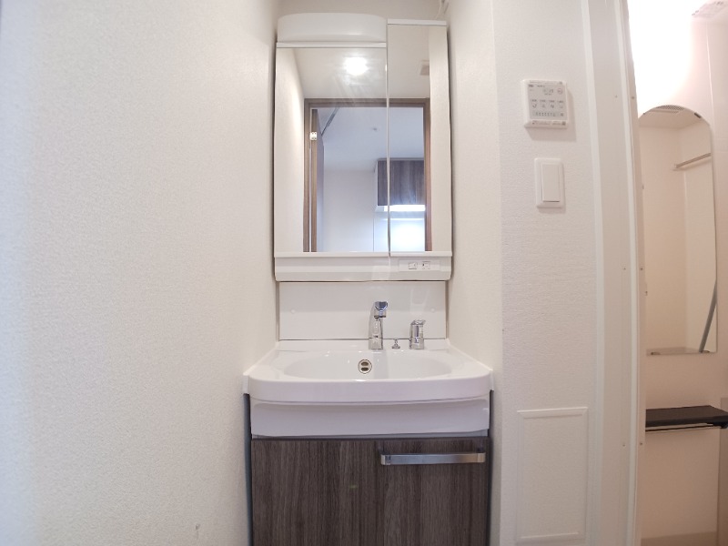 脱衣所内には二面鏡付きの独立洗面台が完備で
