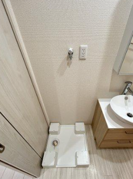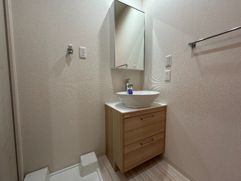 脱衣所にはお洒落な洗面台と洗濯パンが完備!