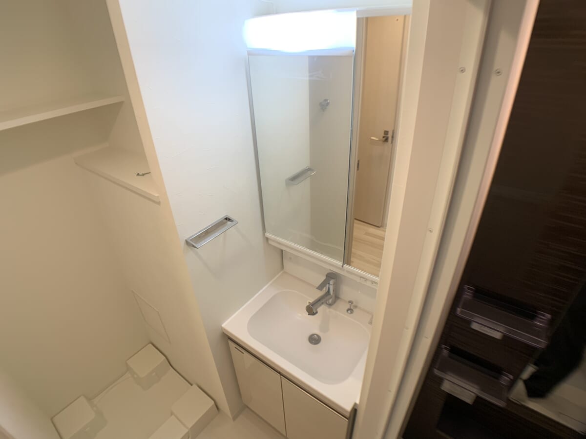 二面鏡付き洗面台と洗濯パン完備で