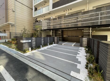 エントランスアプローチには緑豊かな植栽があり
