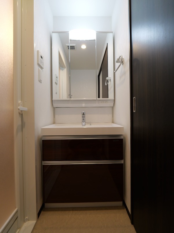 脱衣所内には洗濯パンのほか、身だしなみチェックに便利な三面鏡付き洗面台が採用されています。鏡の角度を調整できるため、ヘアセットやメイク、髭剃りまで細かい部分もしっかり確認できます。