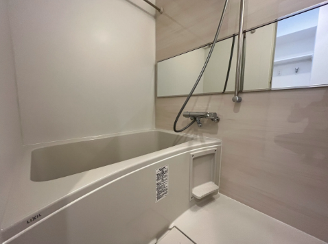 アクセントとなるデザインパネル・横長ワイドミラーを採用した、スタイリッシュなバスルームは空間にメリハリを与え、毎日のバスタイムを心地よいひとときに演出します。