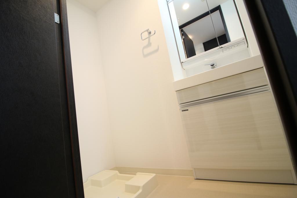 二面鏡付きの洗面台を備えた、清潔感のある脱衣所スペースには洗濯パンも設置されており、日々の洗濯動線もスムーズです。