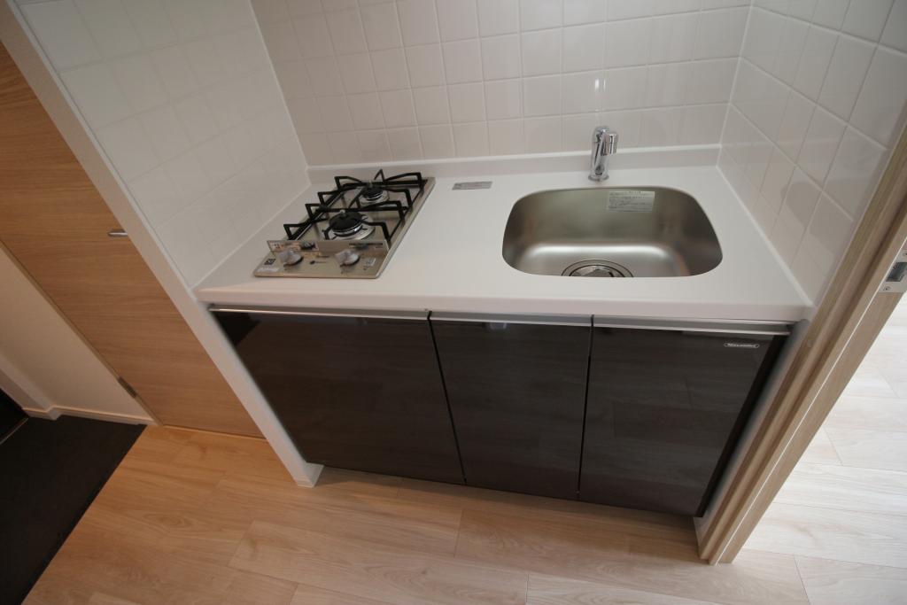 機能的な2口ガスコンロを備えたシステムキッチンを採用しており、調理器具などの収納に便利な吊戸棚も設けられています。