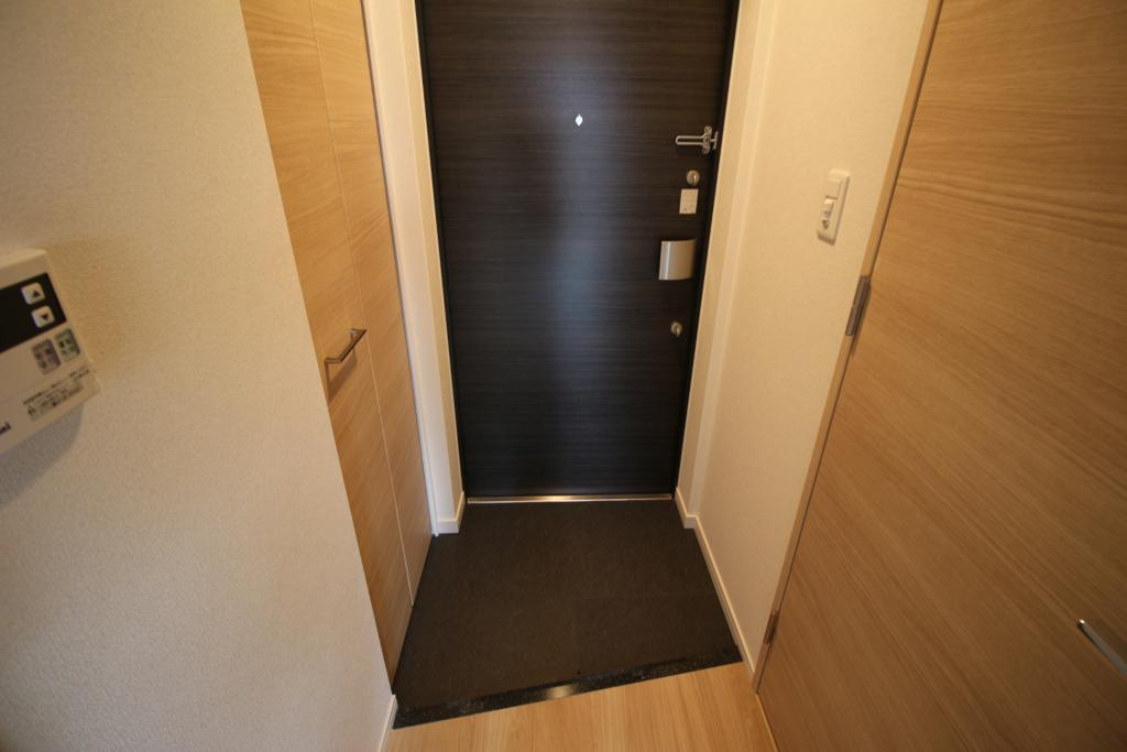 収納力のあるシューズボックスを備えた、すっきりとした玄関スペースは大きな全身鏡付きで、お出かけ前の身だしなみチェックにも便利です。