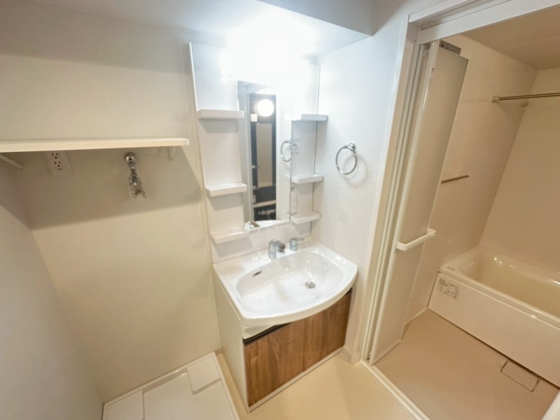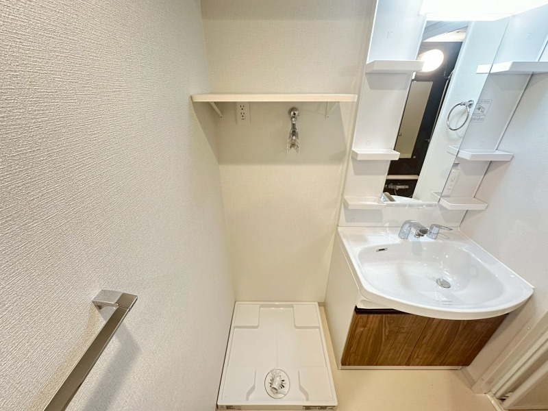 また収納棚付きの洗濯機置き場も備えており、日用品や洗剤類をすっきり整理でき、機能性にも配慮されています。