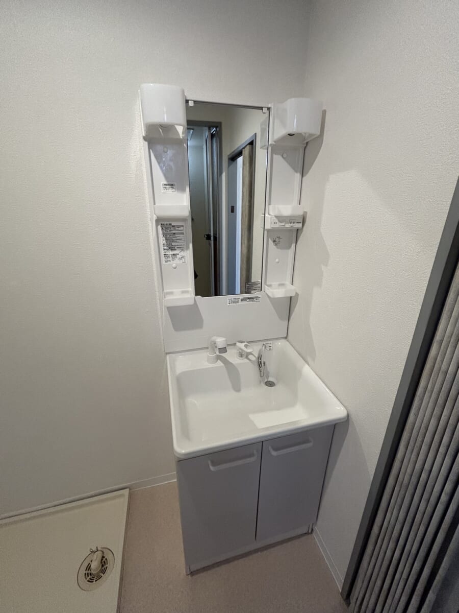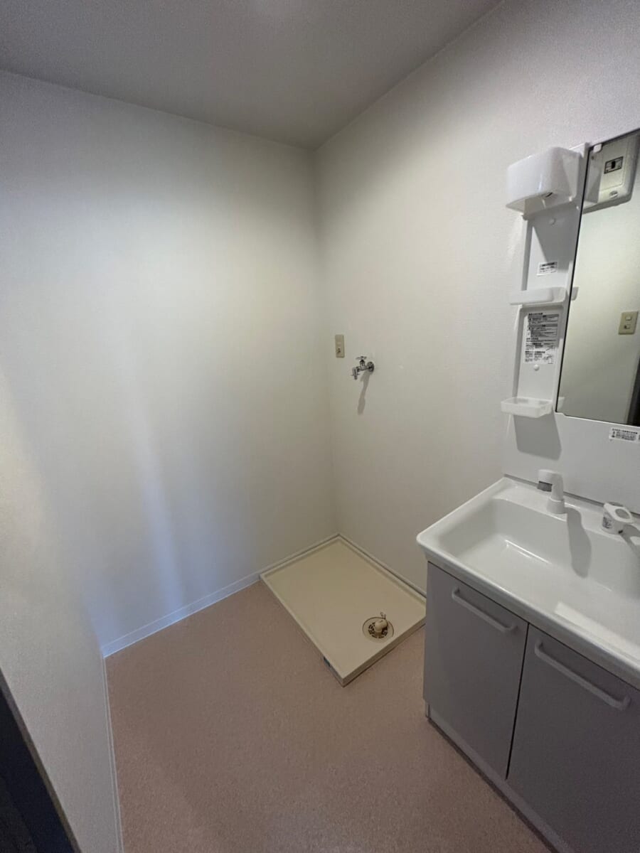 独立洗面台と洗濯機パンを備えた脱衣所は、朝の身支度やお風呂上がりの動線もスムーズで、毎日の生活を快適にサポートします。また、脱衣スペースにゆとりがあり、快適にご利用いただけます。