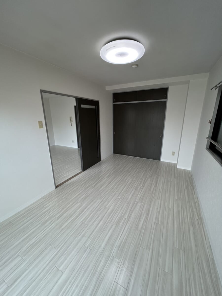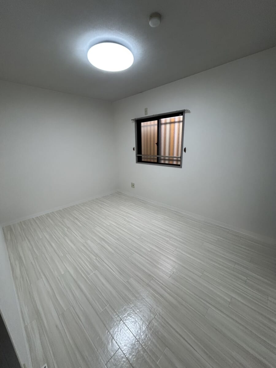 室内は白の木目調フローリングとクッションフロアを採用し、明るく清潔感のある印象に仕上げています。家具やインテリアとも合わせやすく、お部屋全体がすっきりと見えるのも魅力です。