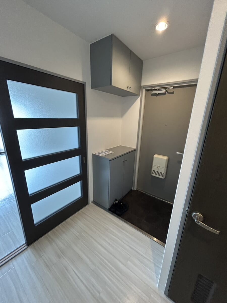吊戸棚付きシューズボックスを備えた玄関は、収納力が高く、靴はもちろん小物類もすっきり整理可能。