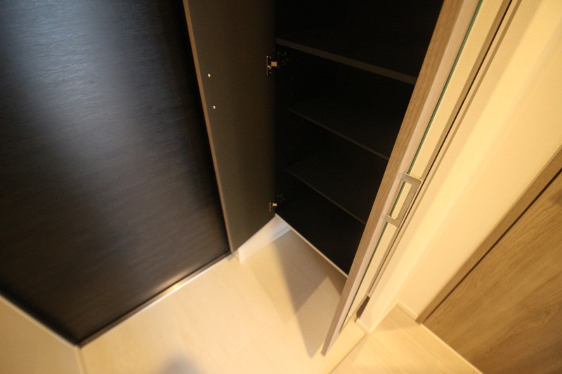 可動棚タイプのシューズボックスは、靴の高さに合わせて自由に調整可能なのでブーツなどもすっきり収納できます。表面は鏡面仕様となっており、空間に広がりを持たせるとともに、外出前の身だしなみチェックにも便利です。
