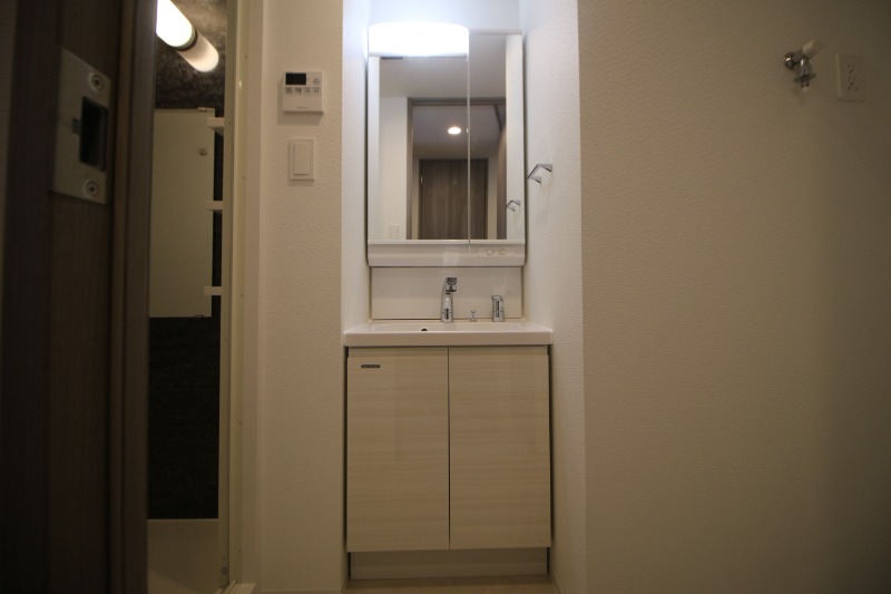 二面鏡付きの洗面化粧台を採用、身だしなみを整えやすく、忙しい朝の準備もスムーズに行えます。また、鏡裏には収納スペースを備え、洗面用品や化粧品もすっきり整理可能です。