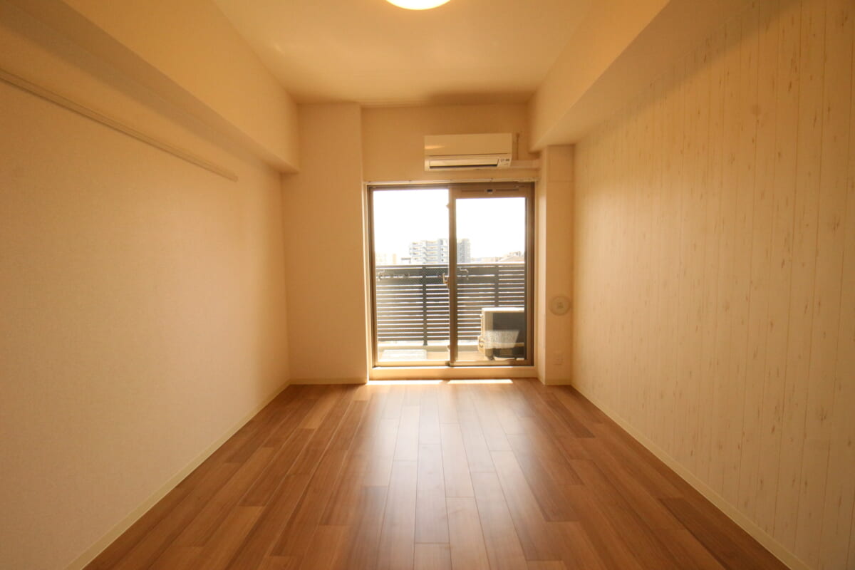 約7.7帖のゆとりある洋室は、家具の配置もしやすく、ベッドやデスクを置いても圧迫感の少ない快適な空間です。また、木目調のアクセントクロスが上質で温かみのある雰囲気を演出し、おしゃれなインテリアとも相性良好!