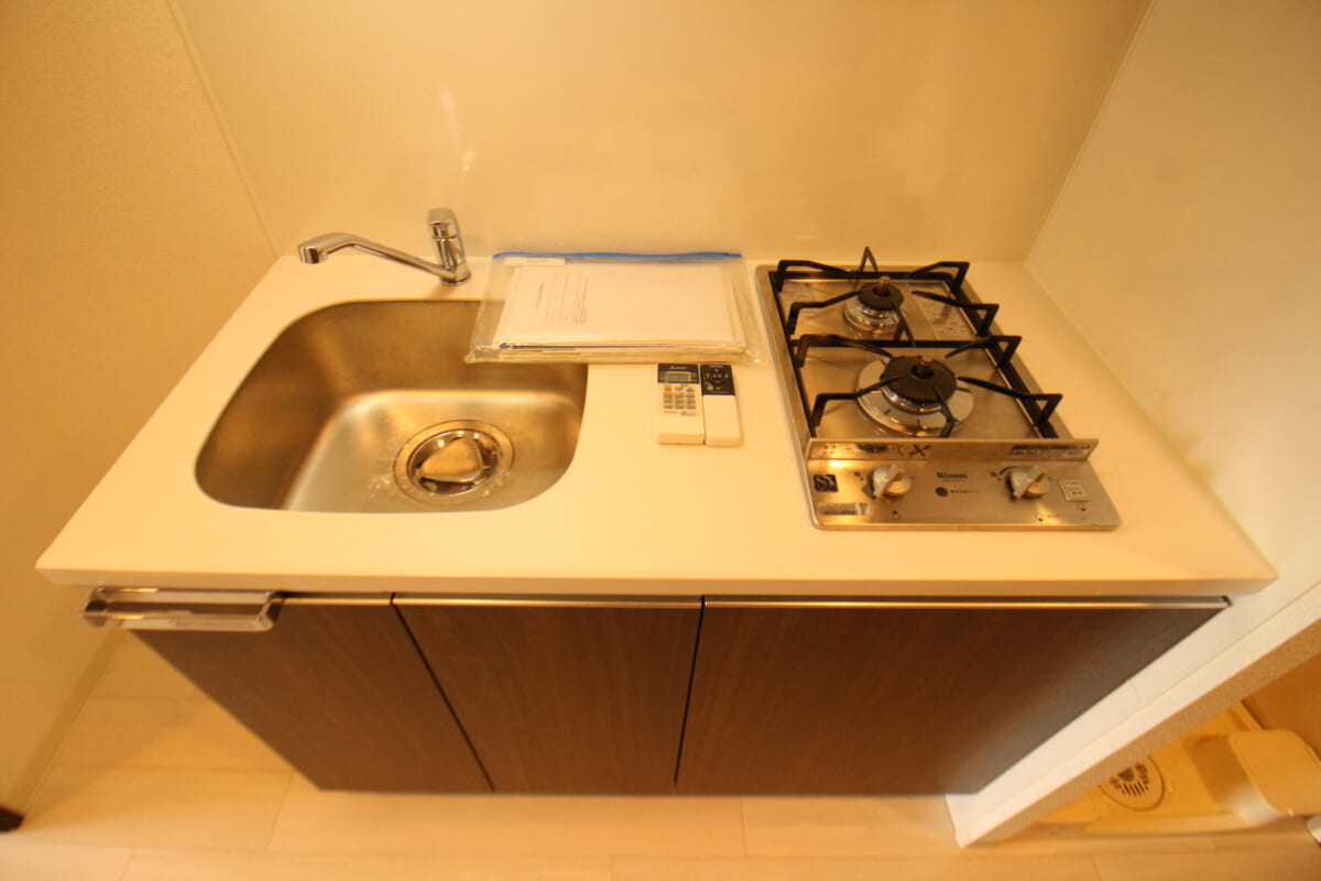 縦型2口ガスコンロを採用したシステムキッチンは、コンパクトながらも同時調理が可能で、自炊派の方にも嬉しい仕様。上下に配置されたレイアウトにより、作業スペースをしっかり確保でき、効率よくお料理を楽しめます。