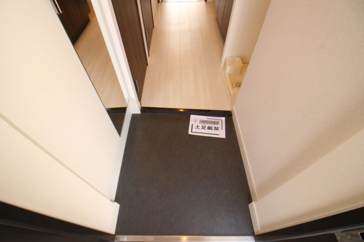 玄関には鏡面仕様の高さのあるシューズボックスを設置。空間に広がりをもたらすデザイン性と、豊富な収納力を兼ね備えており、ご家族分の靴や小物類もすっきりと整理でき、お出かけ前の身だしなみチェックもできます。