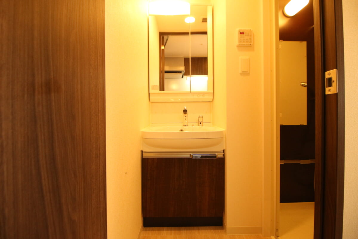 二面鏡付きの洗面化粧台を採用し、身支度やヘアセットもスムーズに行える使い勝手の良い空間。洗面台は木目調デザインで統一され、上質で温かみのある印象を演出。設備にもこだわった高級感のある仕様です。