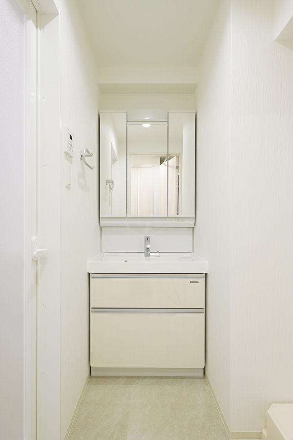 三面鏡付きの洗面化粧台を備えた、機能性の高い脱衣スペースで、洗面台の鏡裏収納を活用すれば、化粧品や洗面用品もすっきりと整理できます。