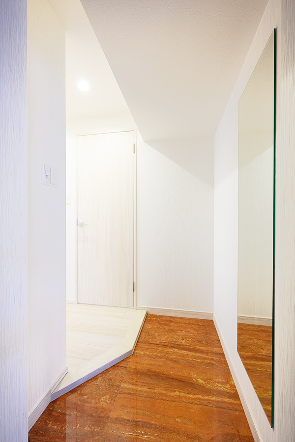壁一面に全身鏡を設置した、開放感のある玄関スペースはお出かけ前の身だしなみチェックもバッチリ!
