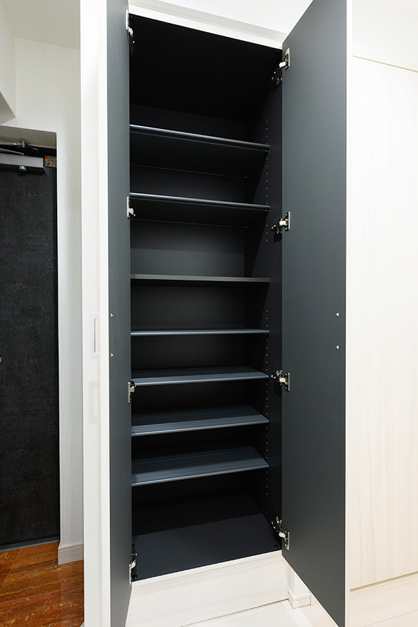 可動棚式のシューズボックスを採用しており、靴の高さに合わせて無駄なく収納可能。ブーツやスニーカーなどもすっきり整理できます。