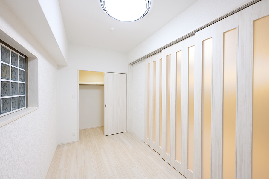 洋室には大容量のウォークインクローゼットを備え、衣類や季節物もすっきり収納可能。室内は白を基調とした明るく清潔感のあるデザインで、開放感あふれる印象に仕上がっています。
