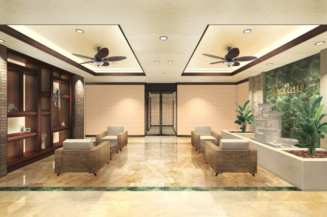 エントランスホールは、艶やかな石調フロアと上質なマテリアルで構成されたラグジュアリーな雰囲気。落ち着いた間接照明とシーリングファンが穏やかな空気を演出し、まるでホテルのラウンジを思わせる迎賓空間が広がります。
