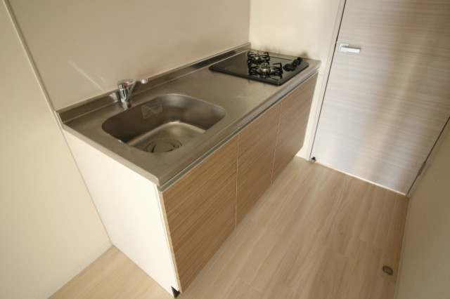 斜め型レイアウトの2口ガスコンロ付きシステムキッチンを採用し、使い勝手の良い調理スペースを確保。吊り戸棚も備えており、食器や調理器具をすっきり収納できます。
