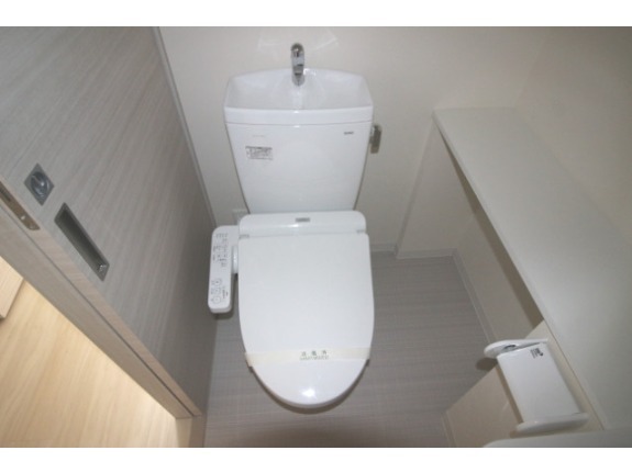 トイレと洗面台を備えた、機能的な脱衣所スペース。水まわりがひとまとまりになっており、朝の身支度や帰宅後の手洗いもスムーズに行えます。
