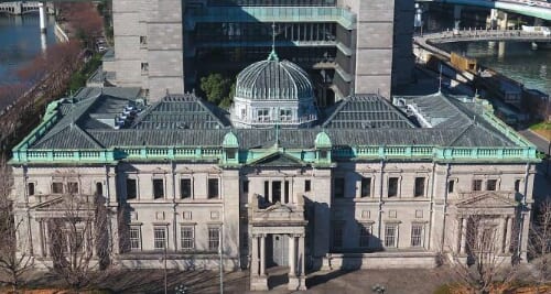 土佐堀川、堂島川、そして大阪のメインストリート・御堂筋に面して建つ近代建築で、明治 36 年(1903)にベルギー国立銀行等をモデルに建設された、緑青の色が美しい円屋根をもつ石造りの 2 階建て本格的洋風建築です。事前予約制で火曜日・水曜日・木曜日に見学会も開催されており、実際に業務を行っている窓口見学や明治時代の部材を使用して再現した記念室等を見学できます。
